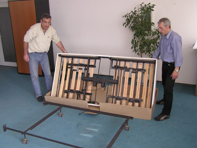 Flip the bed over the frame. It is required that (2) people remove the bed from carton and set it on the metal frame slightly and gently.