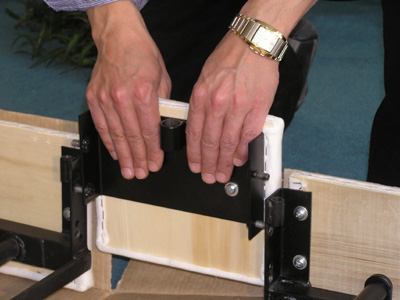 Slide down (with the soft cover out), each panel into a position, so that a pare of bolts are positioned against the right holes (watch the top edge level). Insert them in. The same way insert the both joining panels on one and the same part of the bed.